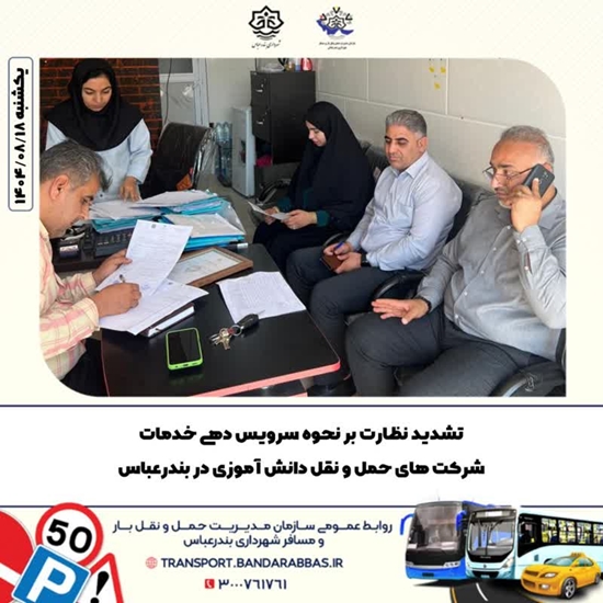 . به گزارش روابط عمومی سازمان مدیریت حمل و نقل بارومسافر شهرداری بندرعباس،مصطفی خادم در این خصوص گفت: نظارت بر نحوه خدمات دهی سرویس های ساماندهی شده حمل و نقل دانش آموزی با حضور بازرسین سازمان و اداره کل تعزیرات حکومتی در آبان ماه صورت گرفت.